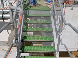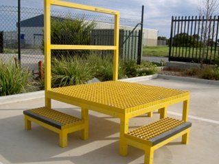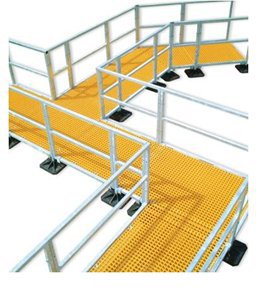 | Walkway systems with Aus Standards Non-Slip Fibreglass Grating sheets with adjustable feet, available with or without handrails. |